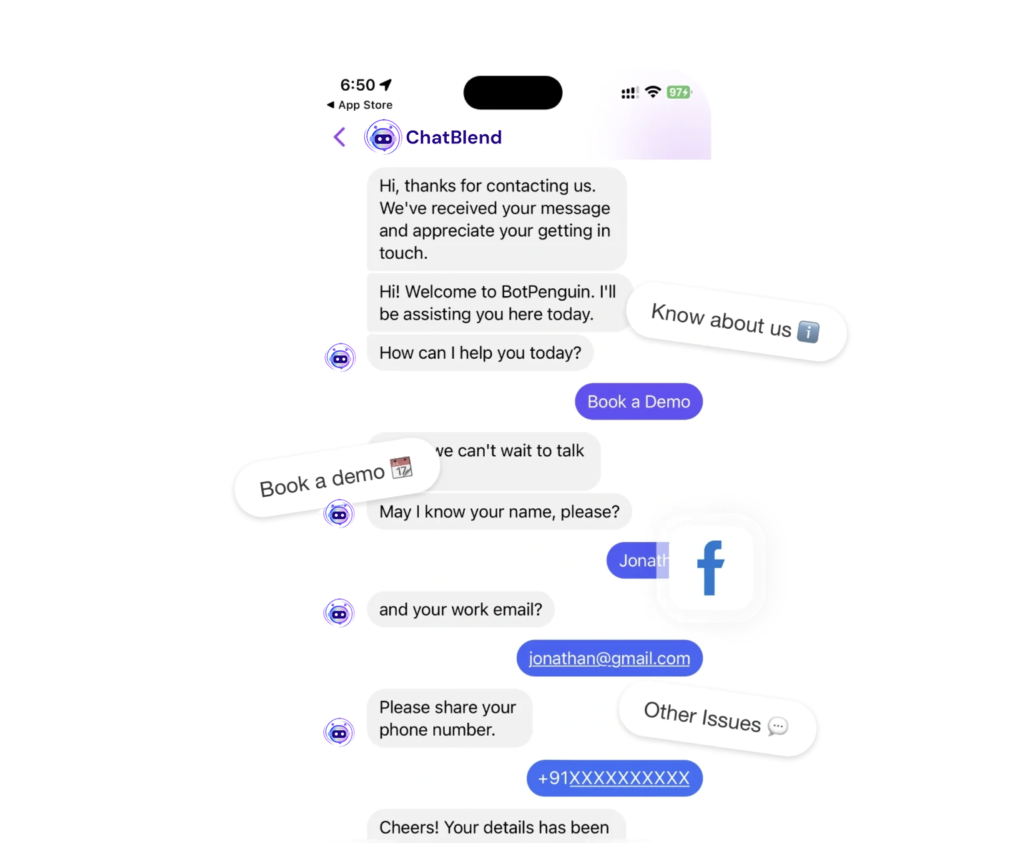 Yes, appointment booking is available in Facebook chatbots. With platforms like Chatblend.ai , you can integrate your chatbot with popular booking systems like Simplybook.me or Google Calendar to automate appointment scheduling.